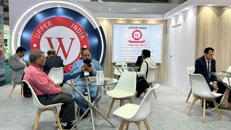 Upper India stall of 48 sqm, in India Rubber Expo 2024, Mumbai. Covering structure like fascia, huge round backlit logo, backlit posters, 3d logo, etc